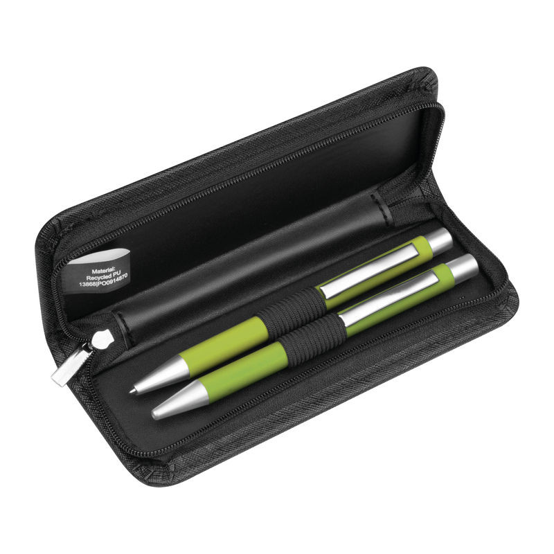 Kék tintával író tollkészlet golyóstollal, ezüst díszítésekkel és hozzá illő mechanikus ceruzával elegáns PU tokban. Tökéletes a stílusos íráshoz!