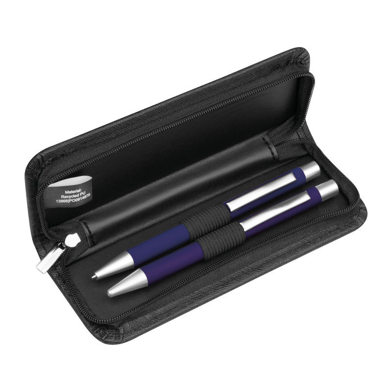 Kék tintával író tollkészlet golyóstollal, ezüst díszítésekkel és hozzá illő mechanikus ceruzával elegáns PU tokban. Tökéletes a stílusos íráshoz!