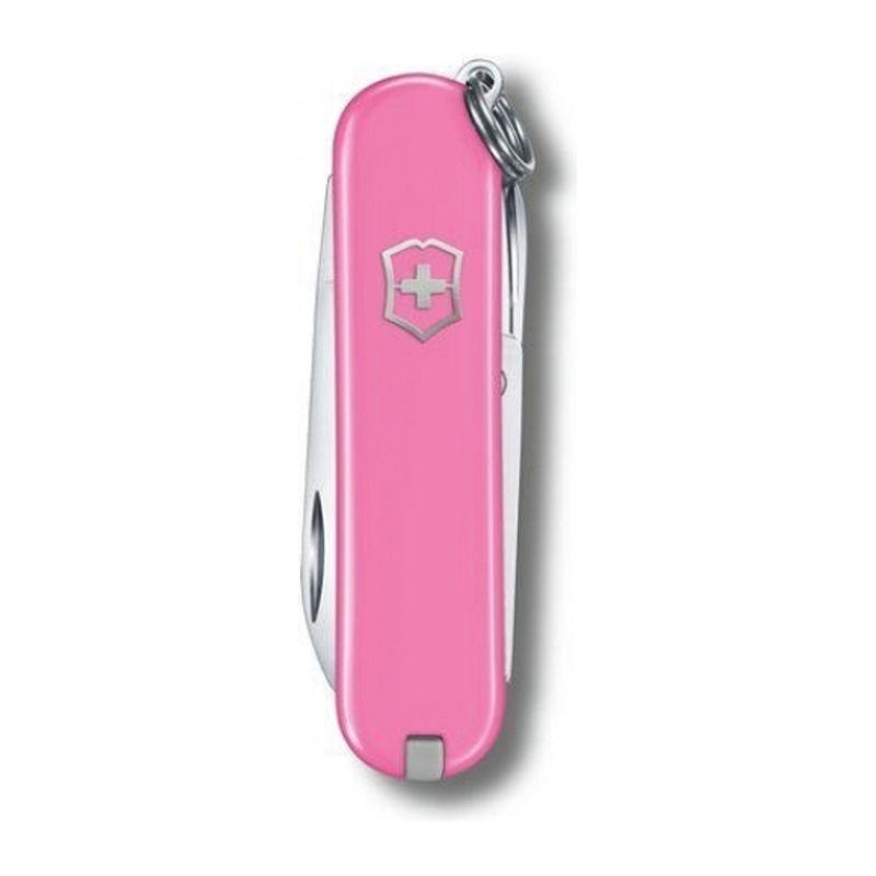 Svájci bicska a következő funkciókkal: kis penge szeletelésre, olló, körömreszelő, kulcstartó karika, csavarhúzó/2,5mm, kulcstartó, fogpiszkáló, csipesz