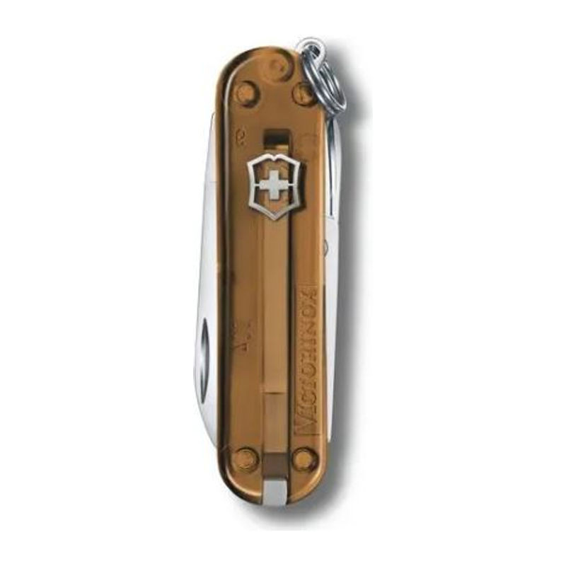 Svájci zsebkés a következő funkciókkal: kis penge szeletelésre, olló, körömreszelő, kulcstartó karika, csavarhúzó/2,5mm, fogpiszkáló, csipesz.