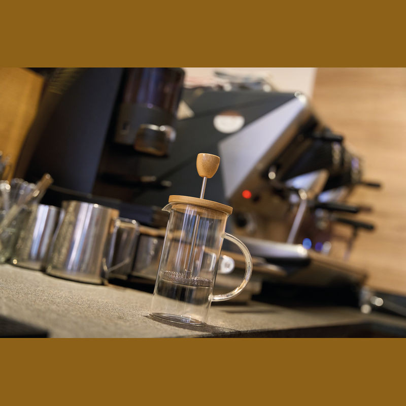 Boroszilikát üvegből készült kávé vagy teaföző kancsó, préssel, bambusz tetővel és 350 ml-es űrtartalommal.