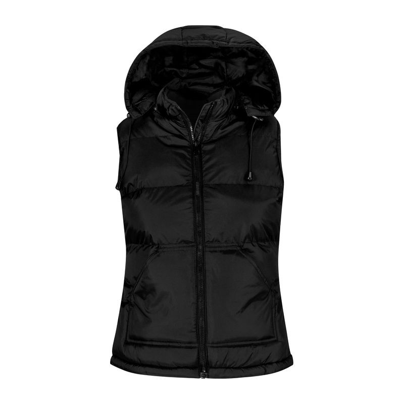 Kiváló árkategóriájú, puha és meleg női mellény, anyaga: 100% nylon, cipzárral záródik. Jellemzők: levehető kapucni, 2 külső zseb, állítható zsinór a nyaknál, hosszított hátsó rész, alakított szabás.