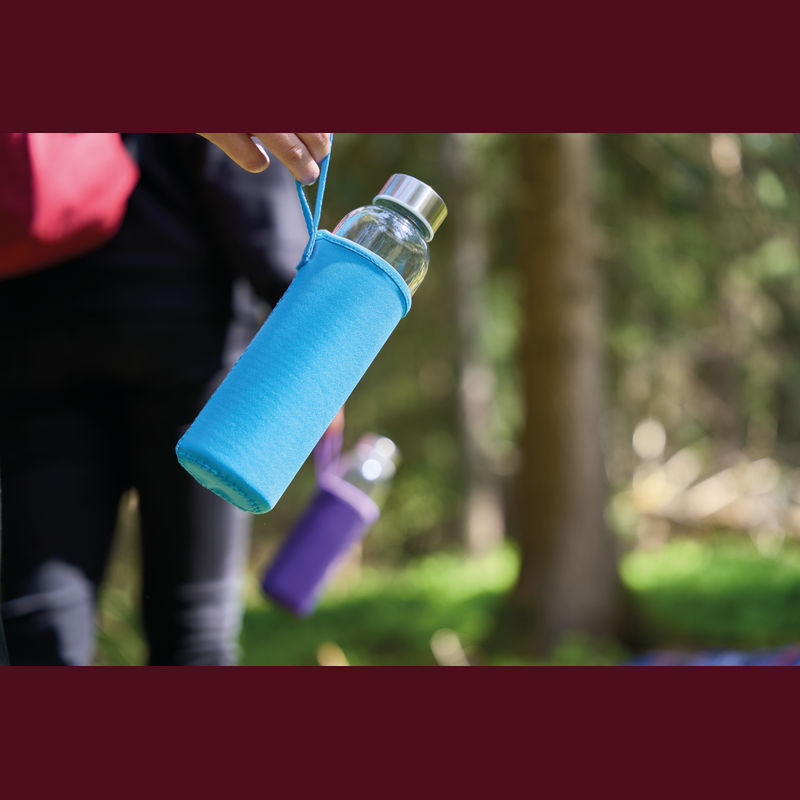 Üveg kulacs neoprén tokban hordozópánttal és szivárgásmentes fém kupakkal. Űrtartalom 500 ml.