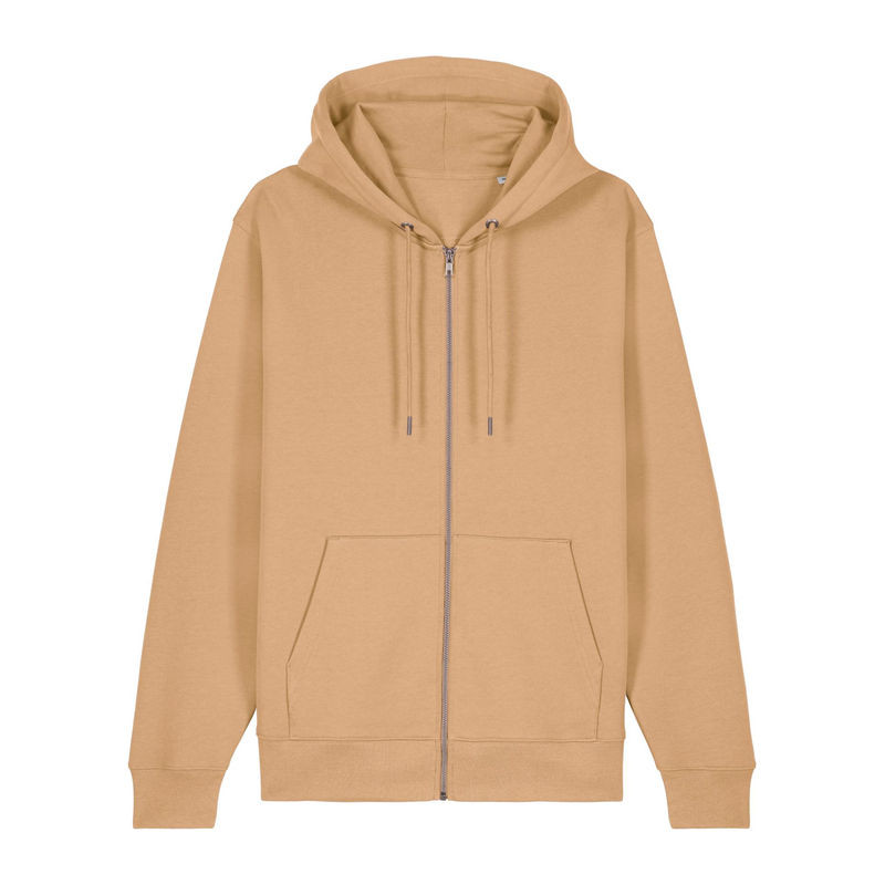 Stílusos, 350 g/m² súlyú, bolyhosított polár kapucnis pulóver modern szabásvonallal, teljes cipzárral és kenguruzsebekkel rendelkezik. 100% organikus pamutból készült.