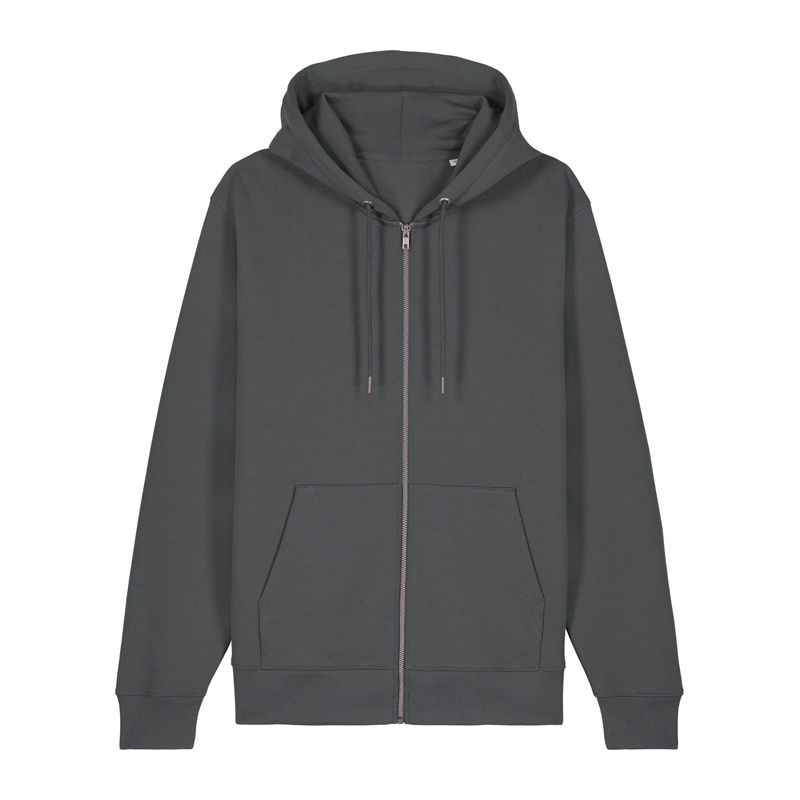 Stílusos, 350 g/m² súlyú, bolyhosított polár kapucnis pulóver modern szabásvonallal, teljes cipzárral és kenguruzsebekkel rendelkezik. 100% organikus pamutból készült.