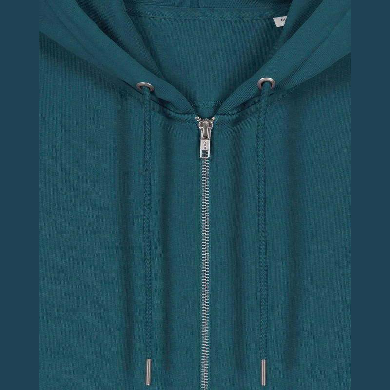 Stílusos, 350 g/m² súlyú, bolyhosított polár kapucnis pulóver modern szabásvonallal, teljes cipzárral és kenguruzsebekkel rendelkezik. 100% organikus pamutból készült.