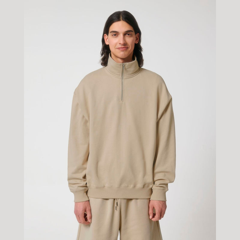 Uniszex pulóver bő szabással és száraz tapintású anyaggal. Negyed cipzárral, bevarrt ujjakkal, bordázott szegélyekkel és halszálkás szalag részletekkel rendelkezik. Stílusos és sokoldalú darab, amely bármely ruhatár tökéletes kiegészítője lehet.